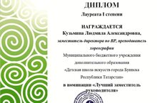 Заместитель директора МБУ ДО "Детской школы искусств города Буинска РТ" по воспитательной работе, преподаватель хореографии Кузьмина Людмила Александровна приняла участие в Республиканском конкурсе "Звезды будущего", в номинации "Лучший заместитель руководителя" награждена Дипломом Лауреата I степени. Поздравляем и желаем дальнейших успехов!