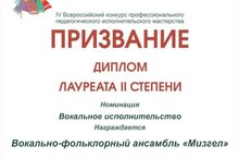 Вокальный ансамбль преподавателей ДШИ "Мизгел" удостоился диплома Лауреата II степени в IV Всероссийском конкурсе профессионального педагогического исполнительства "Призвание". Поздравляем наших коллег и желаем им дальнейших успехов!
