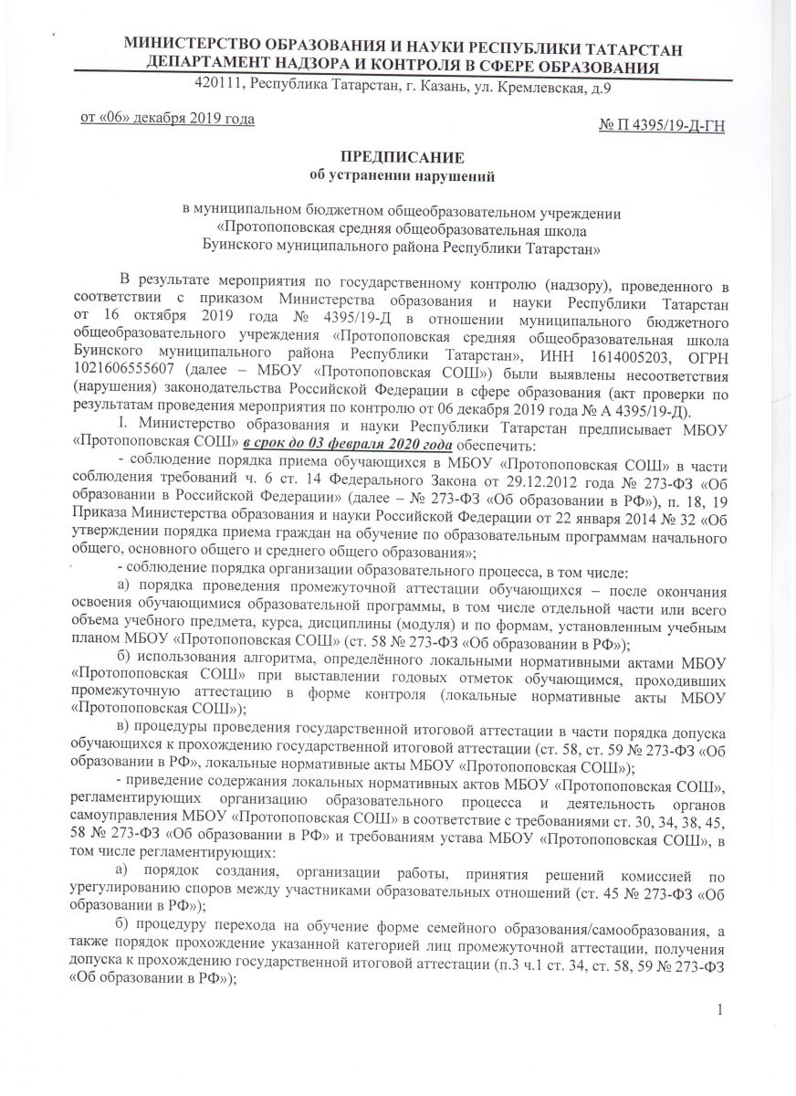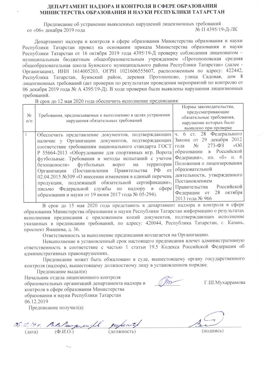 Предписание органов, осуществляющий государственный контроль № П 4395/19-Д-ГН об устранении нарушений