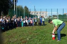 В рамках месячеика безопасности детей провели тренировочную эвакуацию обучающихся и персонала школы на безопасное место. С поставленной задачей справились на отлично. Педагог - организатор ОБЖ Дворцов О.Н. проинструктировал о способах ликвидации очагов возгорания. Показал последовательность действий применения огнетушителя.