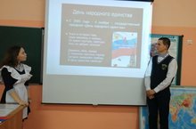 На классном часе Халимова Флера Халильевна рассказала, что праздник единения России установлен в память о событиях 4 ноября 1612 года, когда воины народного ополчения под предводительством Кузьмы Минина и Дмитрия Пожарского штурмом взяли Китай-город, освободив Москву от польских интервентов и продемонстрировав образец героизма и сплочённости всего народа вне зависимости от происхождения, вероисповедания и положения в обществе.