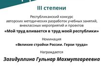 Учитель истории и обществознания Загидуллина Г.М. награждена дипломом lll степени Республиканского конкурса авторских методических разработок учебных занятий, внеклассных мероприятий и проектов "Мой труд вливается в труд моей республики" в номинации "Великие стройки России. Герои труда". Поздравляем!