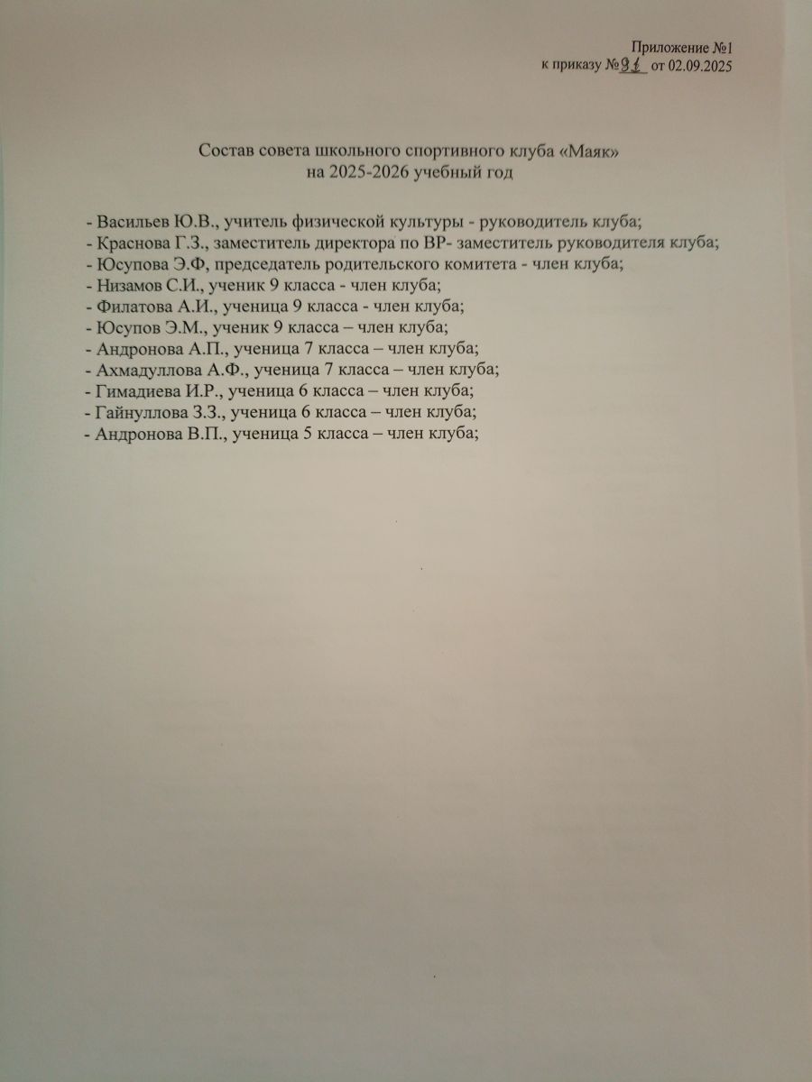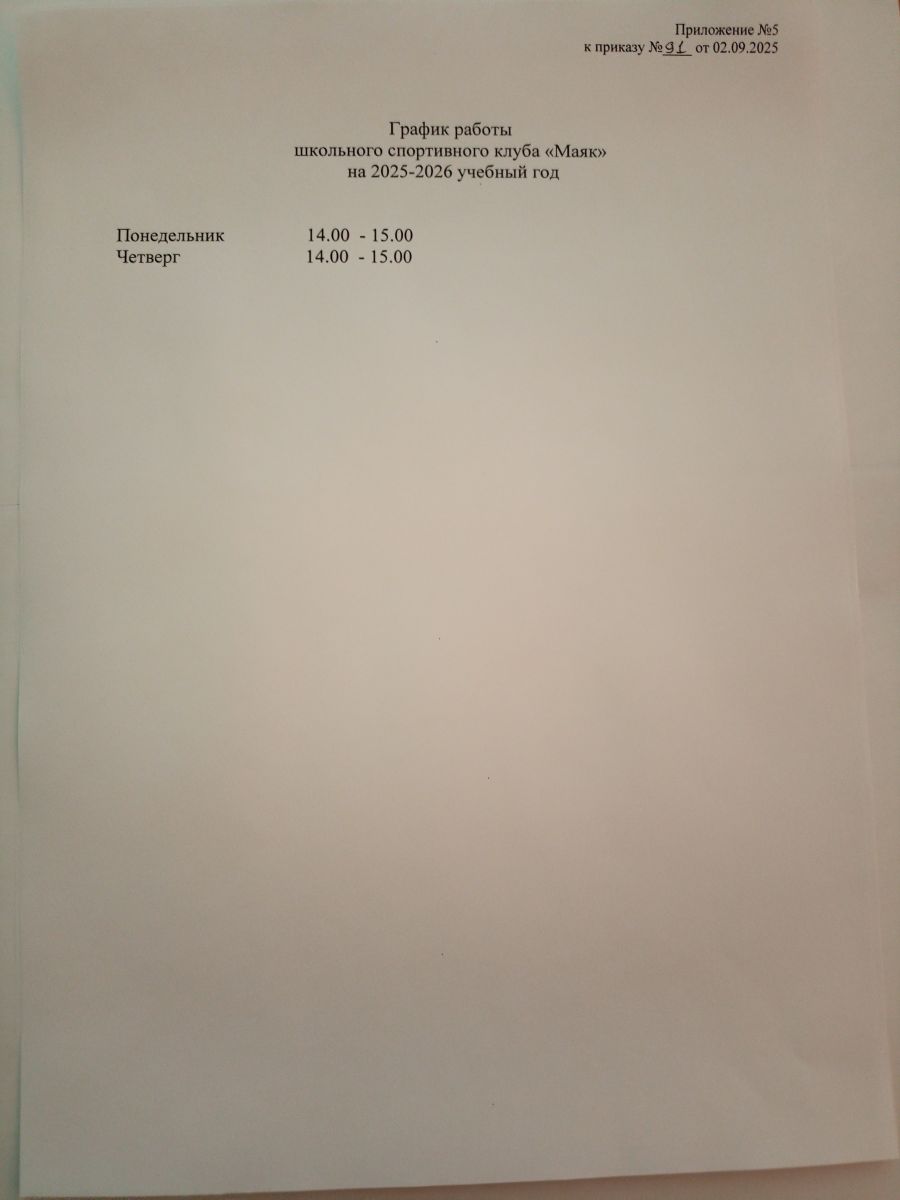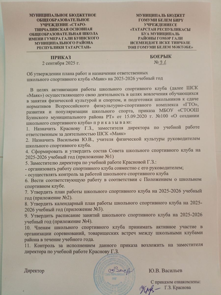 Приказ об утверждении плана работ и назначения ответственных ШСК "Маяк" на 2025-26 учебный год