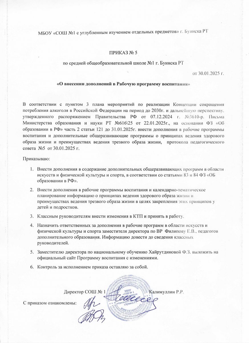 Приказ о внесении дополнений в Рабочую программу воспитания