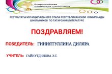 Ученица 11 класса Гиниятуллина Диляра стала победителем муниципального этапа республиканской олимпиады школьников по родной(татарской) литературе. Поздравляем! Молодец! (Учитель: Гайнутдинова Э. Т.)