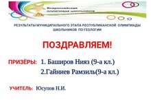 По итогам муниципального этапа Республиканской олимпиады школьников по ГЕОЛОГИИ ученики 9 класса Баширов Нияз и Гайниев Рамзиль стали призёрами. Молодцы! Желаем дальнейших успехов.