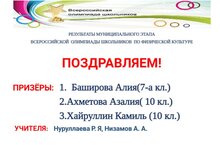 По итогам муниципального этапа Всероссийской олимпиады школьников по ФИЗИЧЕСКОЙ КУЛЬТУРЕ ученицы: Баширова Алия (7-а класс), Ахметова Азалия (10 класс), ученик Хайруллин Камиль (10 класс) стали призёрами. Молодцы! Желаем дальнейших успехов.