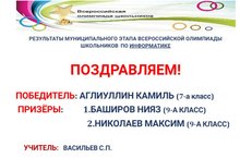 Ученик 7-а класса Аглиуллин Камиль стал победителем, а ученики 9-а класса- Баширов Нияз и Николаев Максим стали призёрами муниципального этапа всероссийской олимпиады школьников по информатике. Поздравляем! Молодцы! (Учитель: Васильев С.П.)