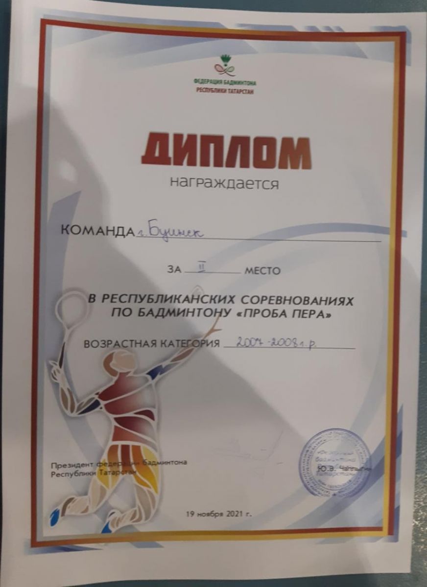 Сегодня в Алькеевском районе с. Базарные Матаки состоялись республиканские соревнования по бадминтону «Проба пера». Команда бадминтонистов нашей гимназии представляла Буинский муниципальный район. Сборная команды г. Буинска возрастная категория 2007-2008 года рождения завоевала 2 место. Поздравляем!!!