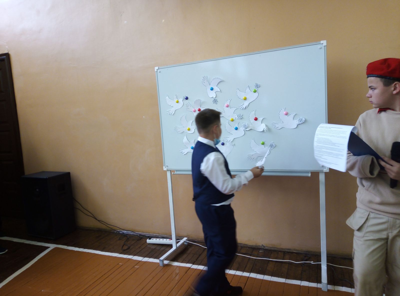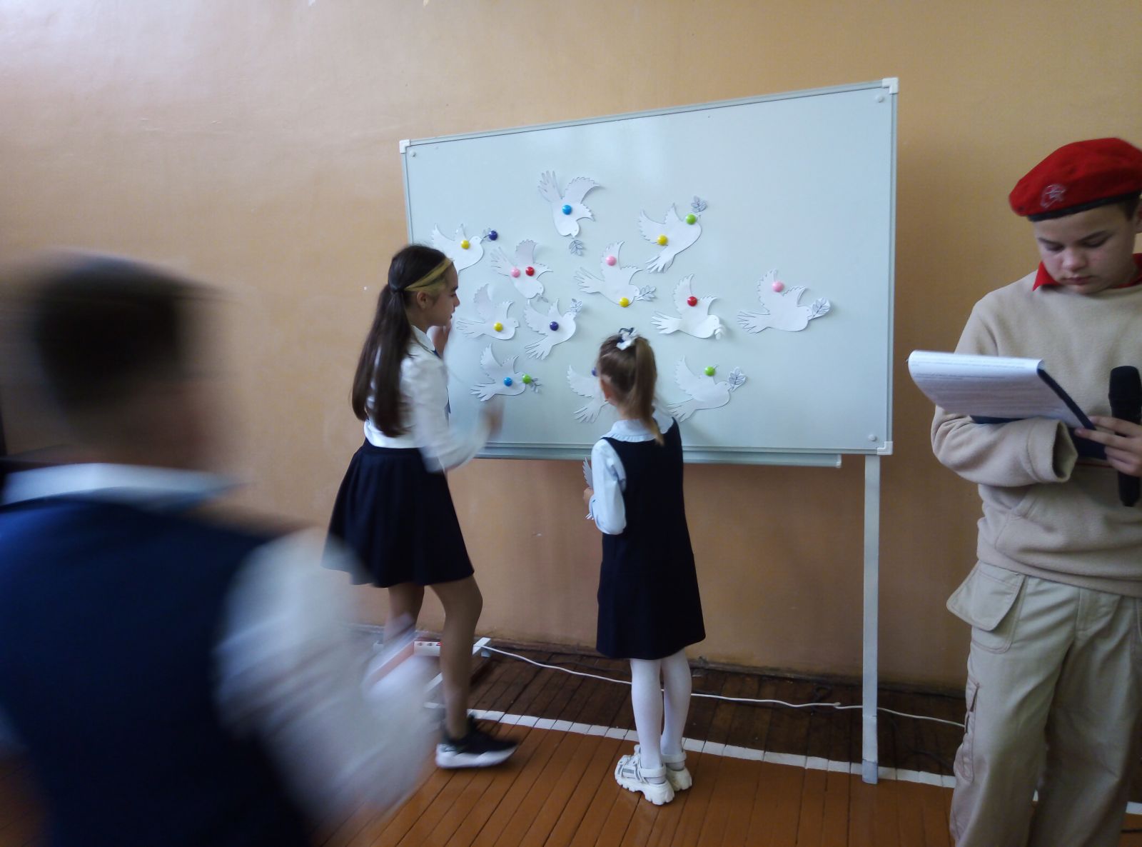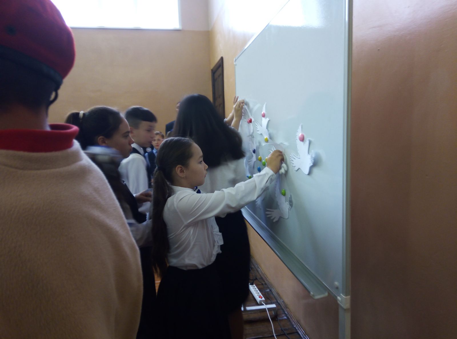 3 сентября в нашей школе была проведена линейка "Памяти жертв Беслана", посвящённая трагическим событиям в г. Беслан. В знак скорби по погибшим была объявлена минута молчания. В заключении ребята прикрепили белых голубей знак Добра и Мира.