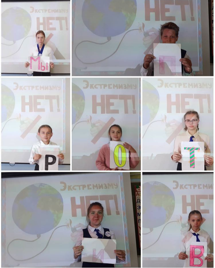 В рамках месячника "Безопасности по профилактике терроризма и экстремизма" отряд РДШ "Поколение Z" провели информационную акцию-флешмоб "Мы против терроризма и экстремизма", направленную на предупреждение и пресечение экстремистской деятельности.