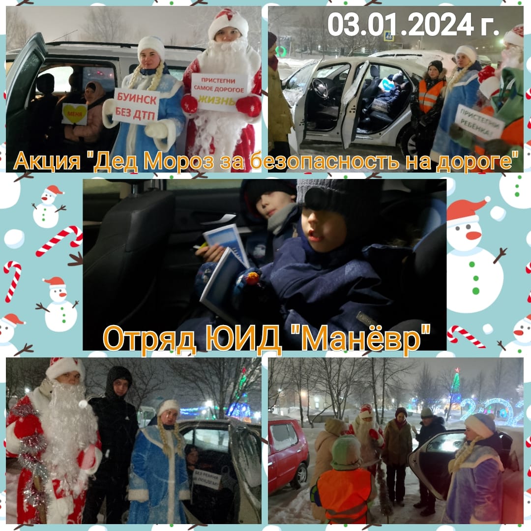 3 января 2024 года Дед Мороз и Снегурочка совместно с ЮИДовцами отряда "Манёвр" МБОУ "Гимназия №5 г.Буинска РТ" провели акцию "Дед Мороз за безопасность на дороге". Они поздравили водителей и пассажиров с новогодними праздниками и напомнили об эффективности использования ремней безопасности и детских удерживающих устройств. Участники акции получили сладости, памятки и светоотражающие элементы от сказочного патруля