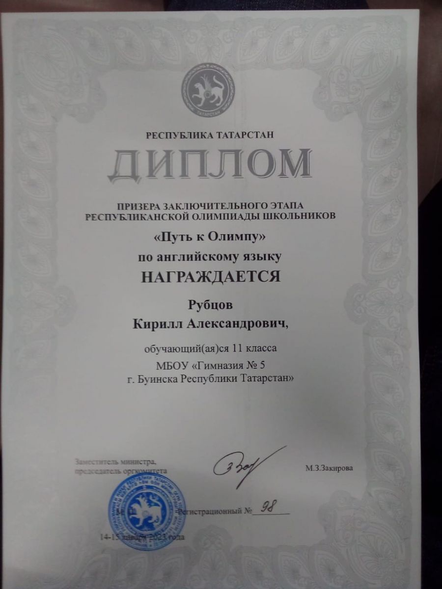 Поздравляем Рубцова Кирилла, ученика 11 класса, призёра заключительного этапа республиканской олимпиады школьников по английскому языку Молодцы! Поздравляем!