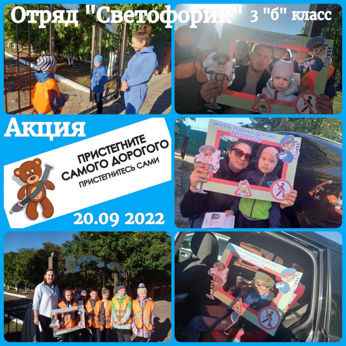 20 сентября 2022 года с целью привлечения внимания общественности к проблеме детского дорожно-транспортного травматизма и к необходимости применения ремней безопасности и детских удерживающих устройств, при правильной перевозке детей в салоне автомобиля, отряд ЮИД "Светофорик" провёл акцию "Пристегни самое дорогое" (3 "б" класс, рук.Хасанзянова Л.М.)