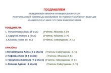По итогам муниципального этапа Республиканской олимпиады школьников по РОДНОМУ(ТАТАРСКОМУ) ЯЗЫКУ ученицы: Мухаметшина Лиана (8-а класс), Кадирова Эльвина (10 класс), Хасанова Лилия (11 класс) стали победителями, Мухаметшина Алина (4-а класс), Нафиева Энже (4-б класс), Гайнуллина Камилла (9-а класс) , Абянова Аделя (11 класс ) стали призёрами.