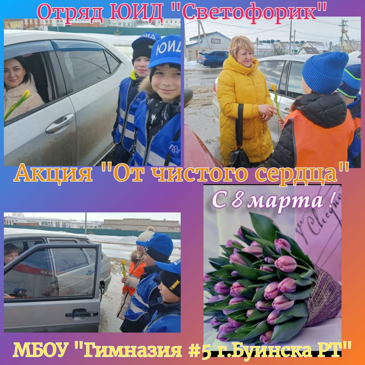 Опубликовано: 08.03.2023Сегодня, 8 марта 2023 года, отрядовцы ЮИД "Светофорик" (учащиеся 3 "б" класса) поздравили автоледи с праздником весны, пожелали безопасных дорог и вручили тюльпаны.