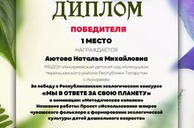 Подведены итоги Республиканского экологического конкурса "Мы в ответе за свою планету". Работа воспитателя Аютовой Н.М. в номинации "Методическая копилка" заняла 1 место. Она представила на конкурс проект "Использование жанров чувашского фольклора в формировании экологической культуры детей дошкольного возраста".