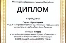 Чувашский республиканский институт образования подвел итоги республиканского фестиваля воспитанников дошкольных образовательных организаций "Хунав" ("Росток"). В номинации "Волшебный мир сказок" наши воспитанники заняли 1 место. Поздравляем!!!