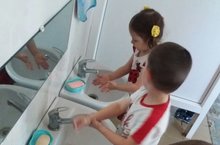 В младшей группе была проведена беседа «Мои ладошки» (Воспитатель Маланчева О.Н.) Дети были приглашены в страну здоровья. Преодолевая препятствия, дети с интересом играли в игры, затем по алгоритму составляли последовательность мытья рук. После чего практически закрепляли культурно гигиенические нормы мытья рук.