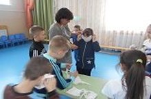 Әниләр өчен балалар кисеп-ябыштыру шөгылендә үз куллары белән нарцис чәчәге ясадылар. Кич әниләр, әбиләр, апалар килгәч бүләкләрен аларга тапшырдылар.