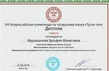 Морзаханова Зөлфия- җиңүче! Ул татар теленнән уздырылган VIII Бөтенроссия олимпиадасында 1 урынны алды. Зөлфияне бу зур җиңүе белән котлыйбыз!!!