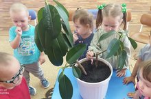 Икенче кече яшьтәге төркем балалары бүлмә үсемлекләрен тәрбияләүнең гади күнекмәләренә өйрәнә башладылар: су сибү, йомшарту һәм су бөркү, танып-белү характерындагы һәм табигатькә карата мәхәббәт, кайгыртучанлык һәм кешелеклелек тәрбияләү максатларында дәрес үткәрелде.
