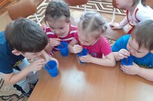 Су һәм буяулар белән кечкенә төркем балалары тәҗрибәлáр ясадылар.