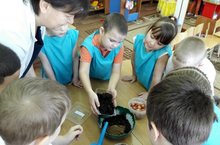 Бүген мәктәпкә әзерлек төркеме тәрбияче белән бергә җир тутырылган тартмаларга суган утыртты. Бу балаларның танып белү дикъкатен, мөстәкыйль эшләү сәләтен арттыра. Хезмәткә сөю хисен уята, пөхтә һәм тырыш эшләү күнекмәләрен формалаштыра.