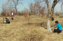 С потеплением погоды началась работа на пришкольном участке. Сегодня учащиеся побелили яблони в саду, участок которого составляет 26 соток.