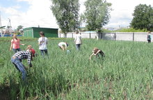 Сегодня в лагере "День труда". Отряды убирали территорию спортплощадки, работали на пришкольном участке.