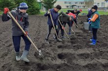 На пришкольном участке начались весенние работы. Посадили лук, морковь, чернушку, чеснок, картофель.