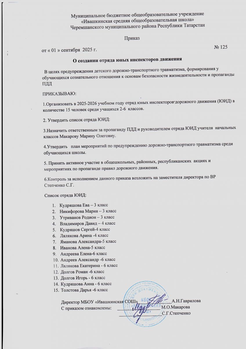 Приказ о создании отряда ЮИД 2025