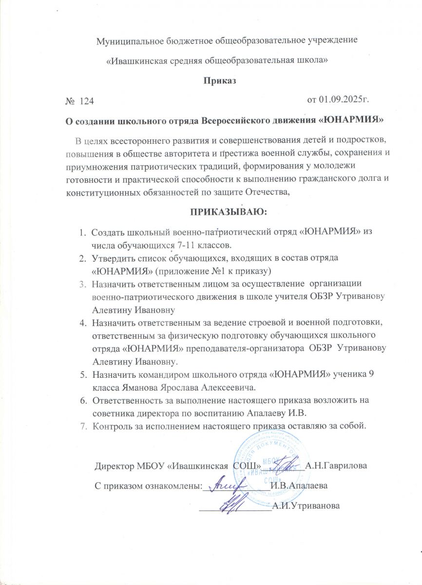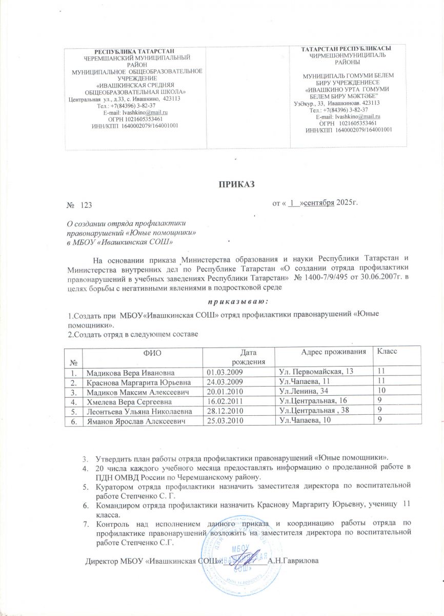 Приказ о создании отряда профилактики на 2025-2026 учебный год