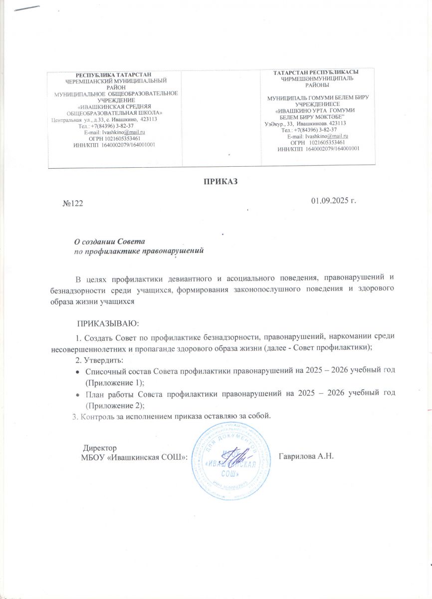 Приказ о создании Совета профилактики на 2025-2026 учебный год
