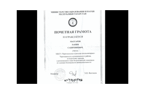 Министерство Образования и науки Республики Татарстан награждает Почетной грамотой Массарова Хакима Сабирзяновича, учителя по основам безопасности жизнедеятельности, за подготовку призера в региональном этапе Всероссийской олимпиады по основам безопасности жизнедеятельности.