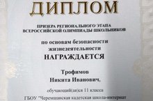 Трофимов Никита, учкеник 11 класса стал призером регионального этапа Всероссийской олмимпиады по ОБЖ.