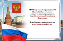 12 декабря - государственный праздник «День Конституции Российской Федерации». В этот день на референдуме в 1993 году была принята российская Конституция.Полный ее текст был опубликован 25 декабря 1993 года в «Российской газете». С тех пор данный праздник принято считать одним из важнейших государственных праздников России. Это и не удивительно, ведь принятие Конституции является одним из самых значимых моментов в истории каждого государства и народа. Поэтому такой праздник существует не только в России, но и в очень многих странах мира. -