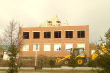 Строители приступили к сбору конструкций чердачной крыши, устанавливают оконные блоки, ведут штукатурные работы и планировку территории -