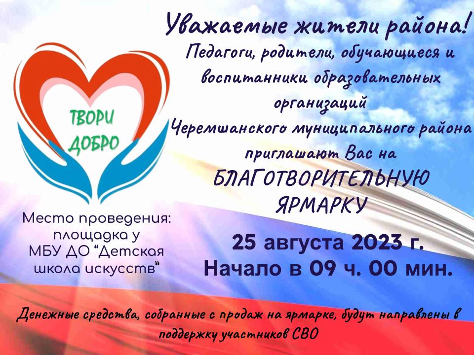 Опубликовано: 03.08.202325 августа на территории Детской школы искусств пройдет благотворительная ярмарка.