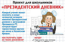 Впервые в Татарстане - проект для школьников "Президентский дневник". В целях формирования привлекательного образа современного педагога и повышения мотивации к получению знаний среди школьников Республики Татарстан Министерством образования и науки Республики Татарстан совместно с представительством газеты «Комсомольская правда» в Республике Татарстан объявлен проект «Президентский дневник».