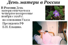 Нет, наверное, ни одной страны, где бы не отмечался День матери. В России День матери стали отмечать сравнительно недавно.