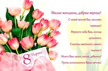 С мартом Вас тающим, С мартом бушующим, С самым ласкающим, С самым волнующим, Счастья вампрочного, Счастья сердечного - Самого доброго, Самого… -