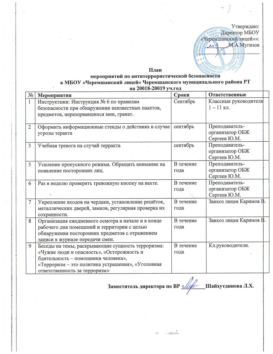 План мероприятий по антирорристической безопасности в МБОУ "Черемшанский лицей"