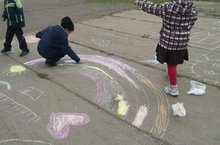 Наши ученики начальных классов нарисовали на асфальте как они представляют мир, среднее звено запускали в небо бумажные голуби. -