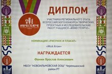 В конкурс рисунков и плакатов по теме «Мой Атом» (для обучающихся 5-11 классов) принял участие ученик 8 класса Фомин Ярослав и занял 9 место, получив диплом участника республиканского этапа. Конкурс был организован Министерством энергетики Российской Федерации и