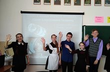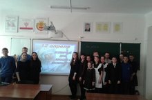 На фото учащиеся 7 класс с фразой, произнесённой первым космонавтом Юрием Гагариным во время старта первого пилотируемого космического корабля «Восток» 12 апреля 1961 года, «Поехали!».