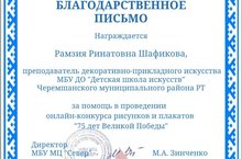 Благодарность за помощь в проведении онлайн -конкурса рисунков и плакатов «75 лет Великой Победы» 12.05.2020
