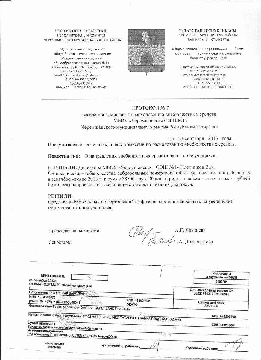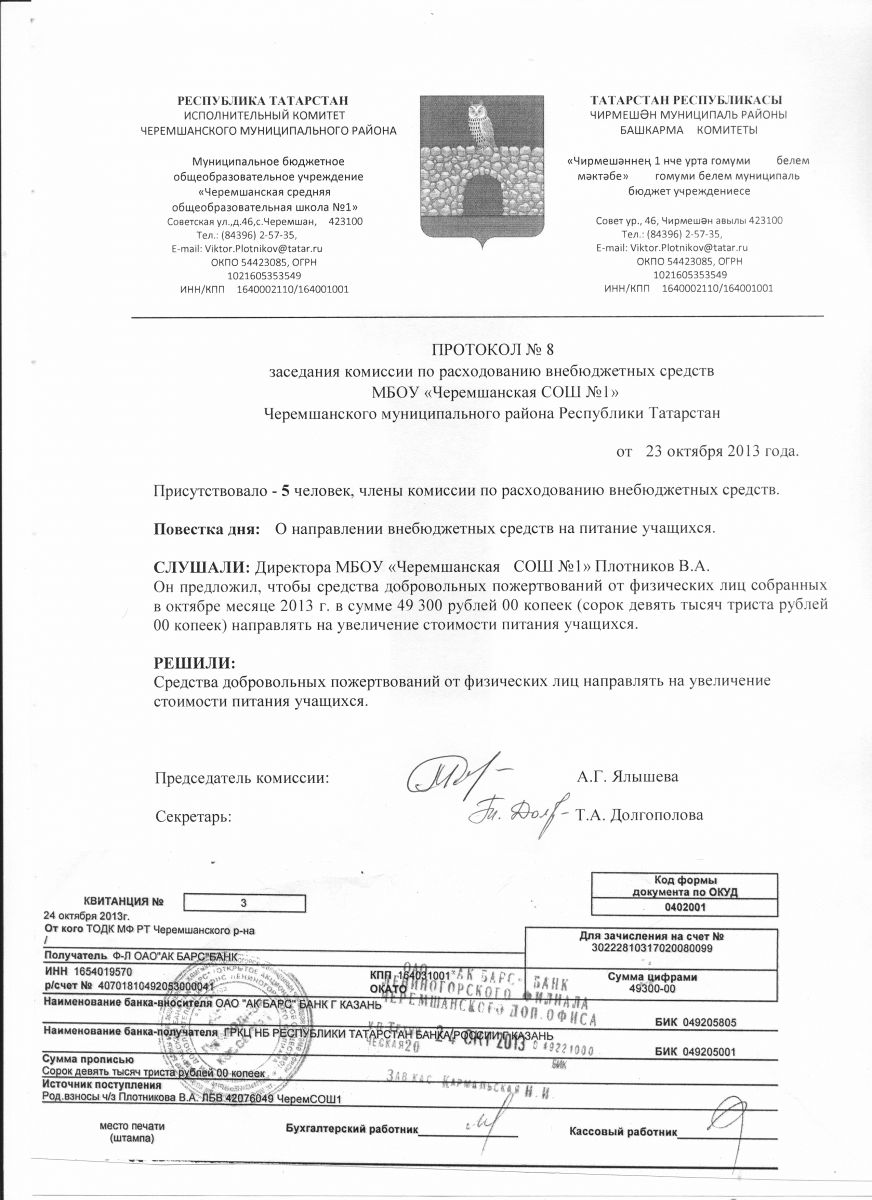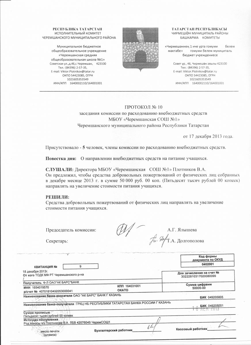 - Протоколы заседания комиссии по расходованию внебюджетных средств 2013 год. Протокол № 5, Протокол №6, Протокол №7, Протокол №8, Протокол №9, Протокол №10