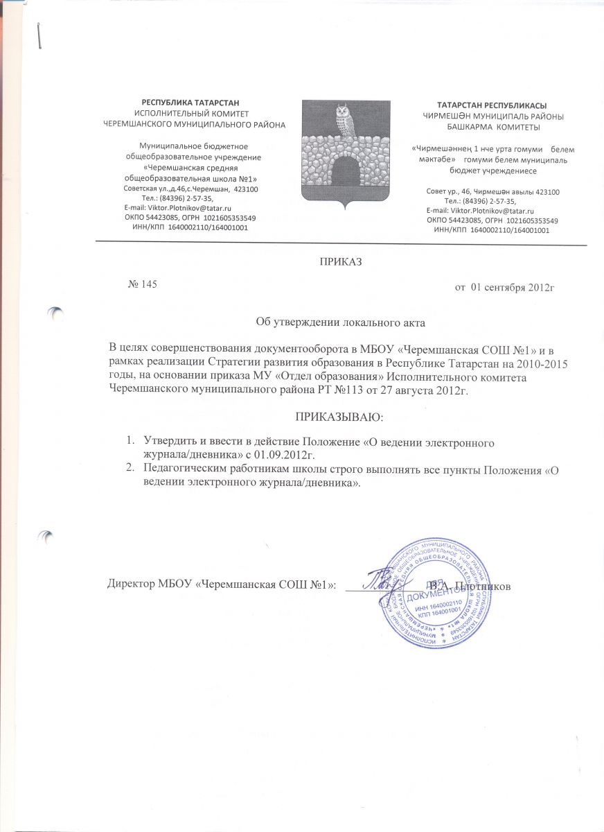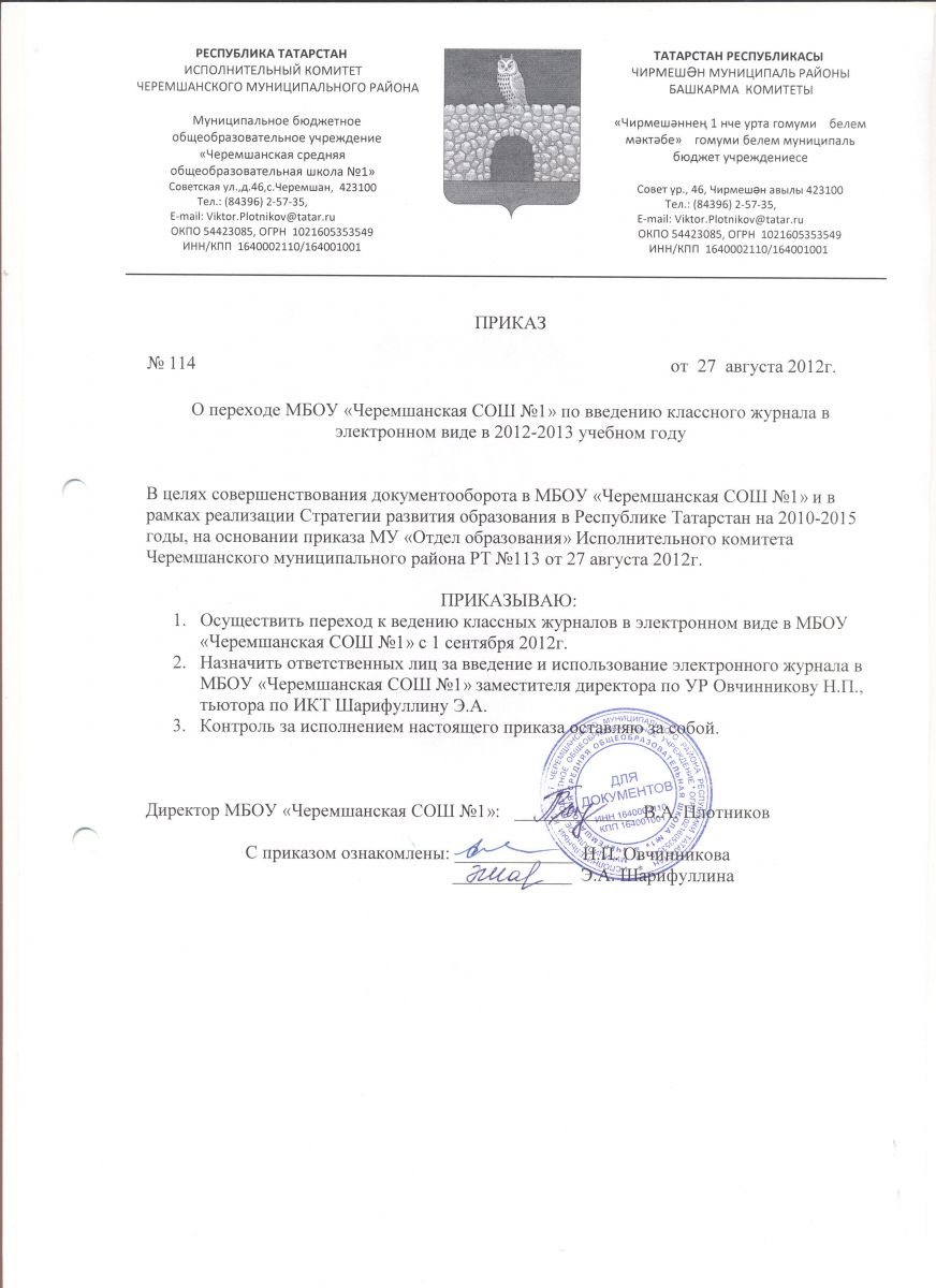 - Приказ МБОУ ЧСОШ№1 о переходе на электронный журнал
