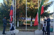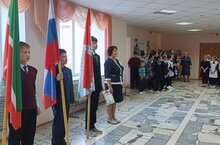 Утро понедельника в нашей школе началось традиционно с выноса государственных флагов и исполнения двух гимнов Российской Федерации и Республики Татарстан.